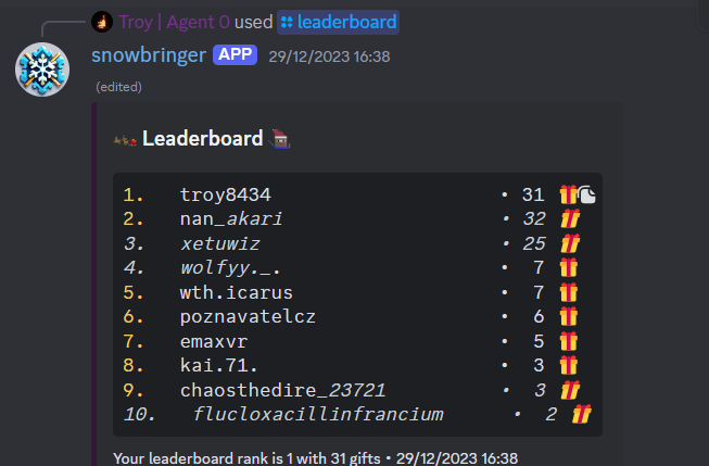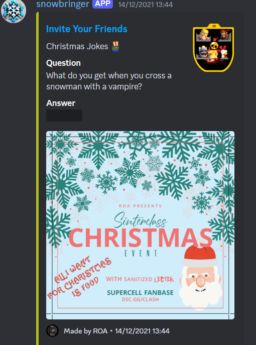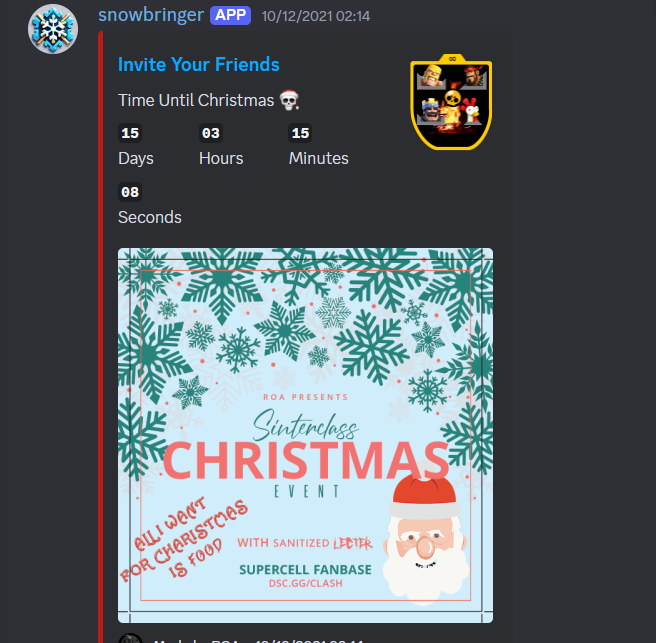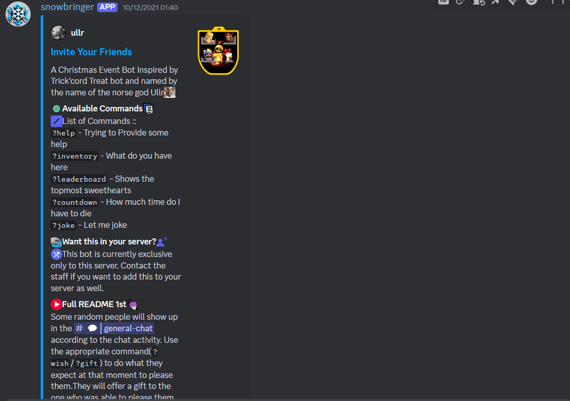 Ullr/snowbringer – Discord Festival Event Bot Description Supercell fanbase An Event Bot made for Supercell fanbase inspired by Trick’cord Treat bot and named by the name of the norse god Ullr. Later renamed to 'snowbringer'. Tags Python Discord Supercell fanbase Share